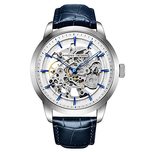 ساعة بيغاني اوتوماتيك السير جلد باللون الازرق المينا اسكيلتون اوبن باك كيس