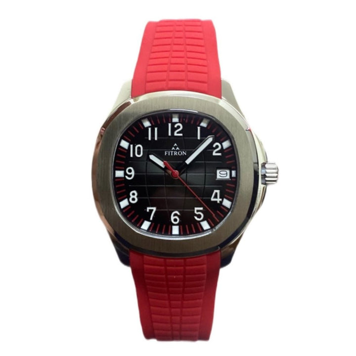 ساعة فيترون رجاليه ربر باللون الاحمر المينا اسود ارقام انجليزيه الطوق باللون الفضي مقاس 40 قصة الباتك فيلب